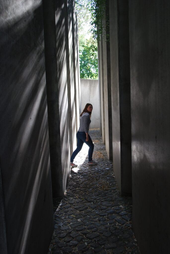 Die Architektur des Museums beabsichtigt ein Unwohlsein, das durch schräge Böden und einengende Wände hervorgerufen wird. In der Ausstellung werden verschiedene Wege dargestellt, die sich mit dem Gehen und Bleiben beschäftigen. Wir konzentrierten uns hierbei auf die Flucht aus Deutschland. Der Workshop begann mit der Frage, was Heimat für uns bedeutet. Somit wurde ein persönlicher Bezug hergestellt, der uns half, die Situation im Ansatz nachzuvollziehen. Wir arbeiteten zudem mit Dokumenten, um verschiedene Schicksale kennenzulernen. Ein besonderer Teil des Museums war ein Abschnitt im Freien, der dem Holocaust-Mahnmahl nahe des Brandenburger Tors ähnelte: massive Betonblöcke, unebener Boden. Es ist fast unmöglich, durch das Stelenfeld zu laufen. Es ist mehr ein Taumeln. Es scheint, als könne man den unzerbrechlichen Betonklötzen nicht entkommen. Es stellt das Gefühl der Flucht dar, die Heimat zu verlassen und in das Unbekannte zu fliehen, ohne zu wissen, was die Zukunft bringen könnte.